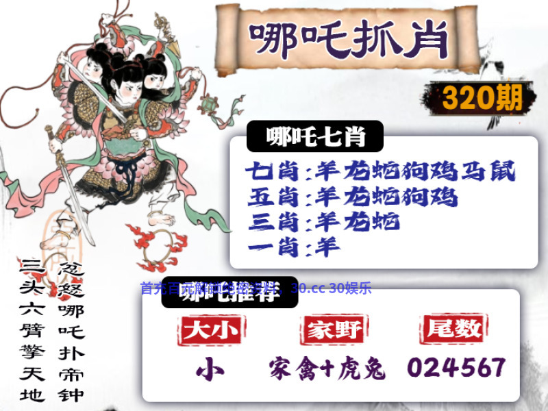 | 324期: ①七肖中特:马羊蛇猪兔鸡鼠 ②大小中特:小数 ③家野+2肖:野兽+羊狗 ④精准六尾:013457 |