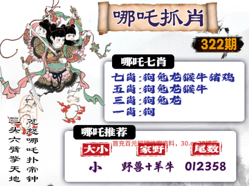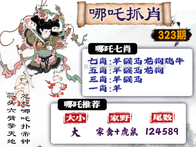 | 323期: ①七肖中特:羊猴马龙狗鸡牛 ③家野+2肖:家禽+虎鼠 ④精准六尾:124589 |